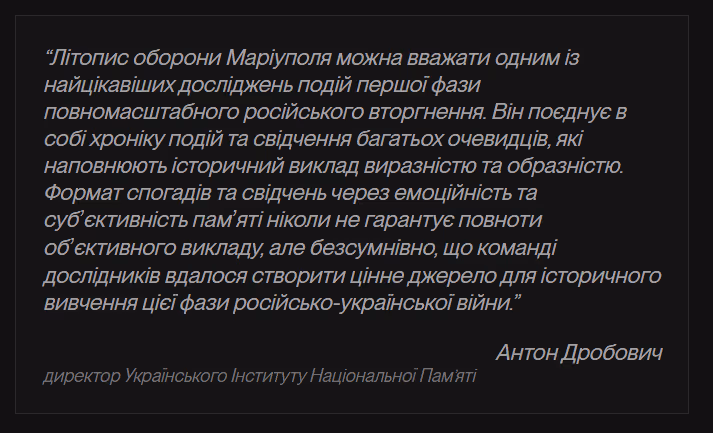Правду про події весни 2022 року Росія прагне знищити так само, як намагалася стерти Маріуполь з лиця Землі. Цей Літопис створено, щоб протиставити дезінформації підтверджені факти та свідчення очевидців.